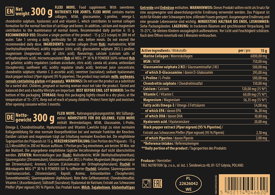 collagen, MSM, glucosamine, L-proline, omega-3, chondroitin sulphate, hyaluronic acid and vitamin C, which contributes to normal collagen formation for the normal function of cartilage and bones. In addition, calcium and magnesium contributes to the maintenance of normal bones. Recommended daily portion is 15 g. RECOMMENDED USE: Dissolve a single portion of the product – 15 g (2,5 scoops) in 200 ml of water. Take 1 serving a daily, preferably for 30 min. before meals. Do not exceed the recommended daily dose.